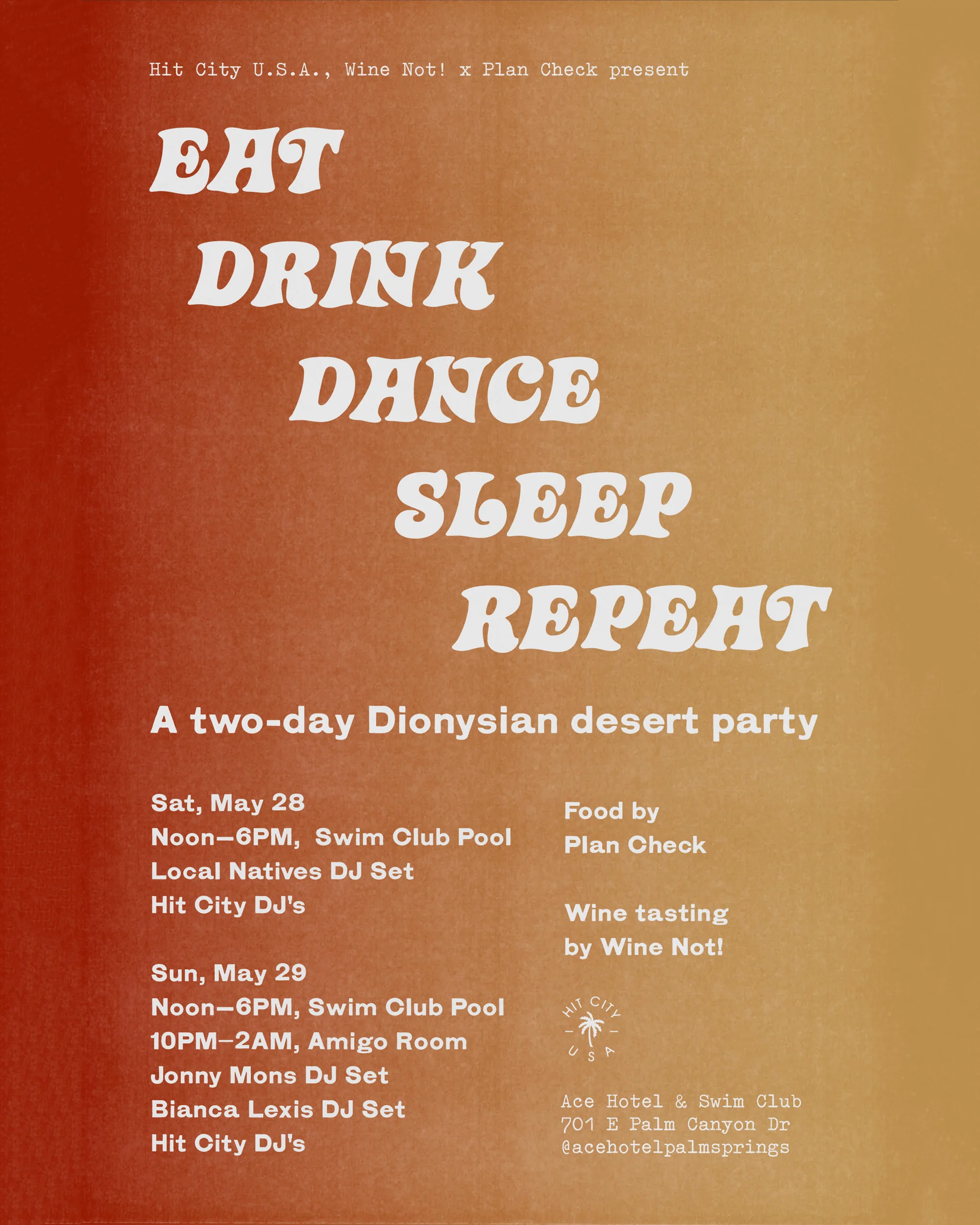 Festivities begin Saturday, May 28, at The Swim Club Pool featuring DJ sets from indie kings Local Natives and your very own Hit City DJ's. Food will be handled by the venerable Plan Check coupled with a selection of bottles curated by the effervescent Wine Not! team.